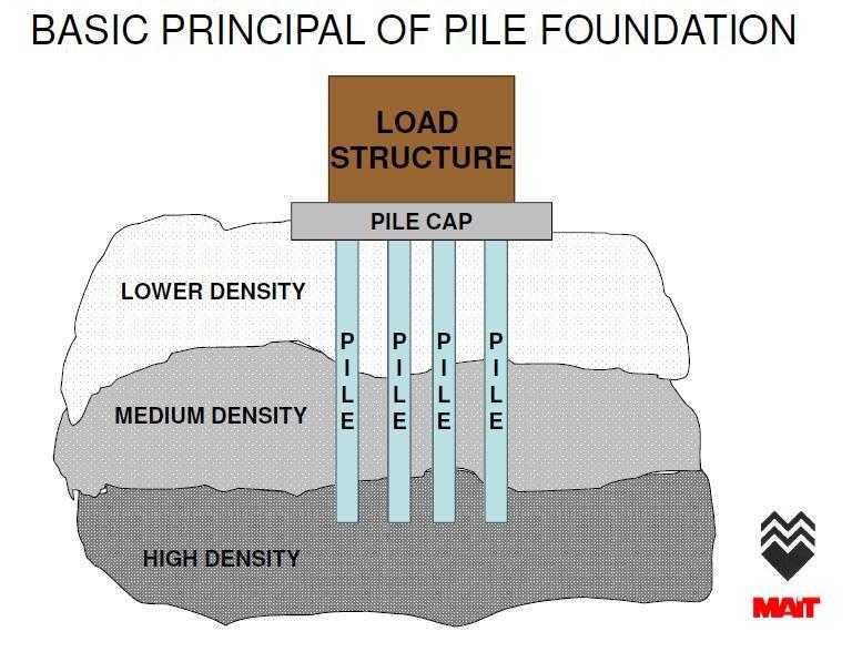 A pile foundation is a type of deep foundation used when the surface soil is too weak to support the weight of a structure. Instead of relying on shallow footings near the ground surface, piles are long columns made of steel, concrete, or wood that are driven or drilled deep into the ground until they reach stronger soil layers or bedrock. The structural loads from the building travel down through the columns and foundation system into the piles, which transfer the forces either through end bearing at a strong layer or through skin friction between the pile surface and surrounding soil. This system allows heavy structures such as skyscrapers, bridges, and waterfront buildings to remain stable even when built on soft or loose ground.